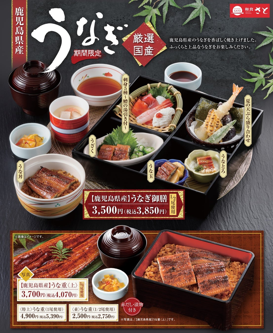 国内197店舗を展開する「和食さと」では、鹿児島県産の【鰻(うなぎ)】を使用したメニューを6月27日(木)より期間限定・数量限定で販売します。