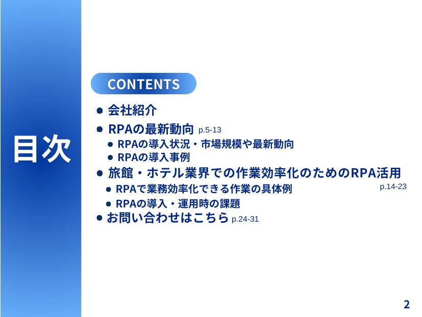 株式会社ベクトル(本社:東京都港区、代表取締役会長兼社長:西江 肇司、東証プライム:6058)の子会社であるOwned株式会社(東京都品川区、代表取締役社長、石井翔、以下「当社」)は、旅館・ホテル業界向けに「RPA導入で業務を自動化する成功事例8選と導入時に直面する5つの課題レポート」【2025年1月版】(全31ページ)を無料公開いたしました。