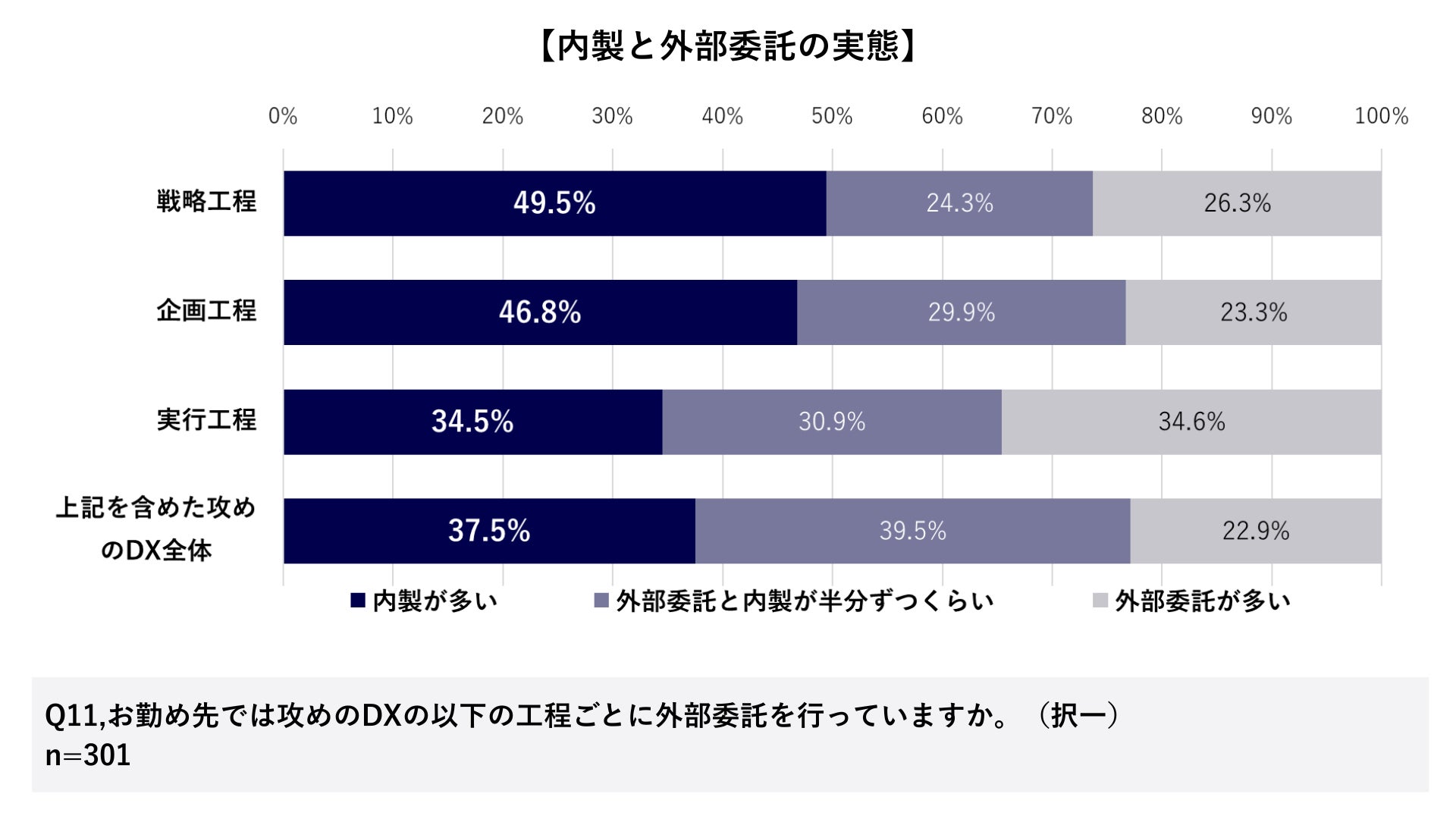 戦略・企画工程では「内製が多い」が5割近く(49.5%/46.8%)で、「外部委託が多い」は4分の1程度にとどまり(26.3%/23.3%)、内製体制の構築が進んでいる。