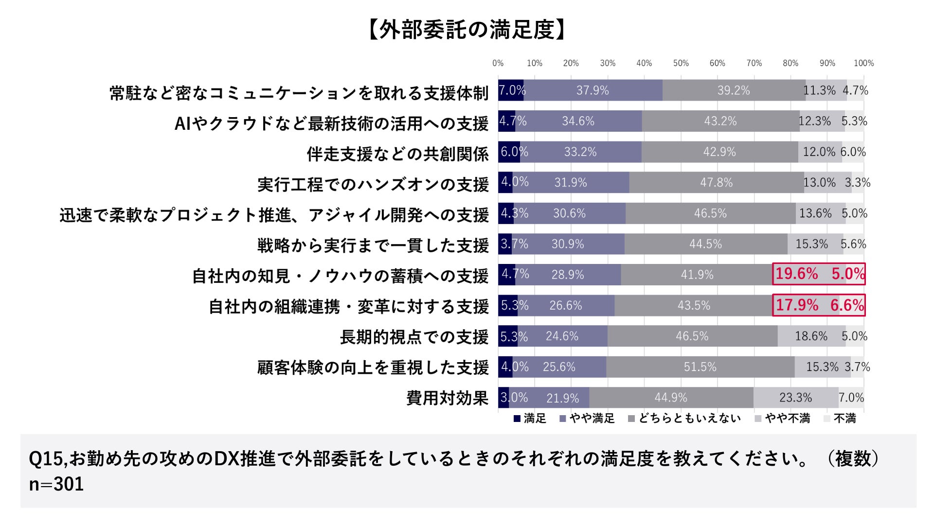 費用対効果以外で不満度が高い項目は、「自社内の知見・ノウハウの蓄積への支援(24.6%)」、「自社内の組織連携・変革に対する支援(24.5%)」。内製体制への貢献も求められていることがうかがえる。
