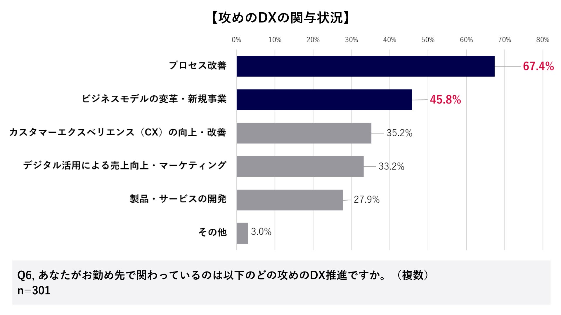①「ビジネスモデルの変革・新規事業(45.8%)」など攻めのDXが進行中