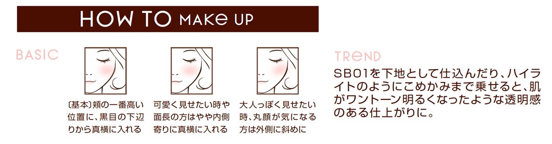 さりげない発色ながら自然な血色感を感じられる4色のニュアンスカラー。ピュアなブルーカラーの「SB01(シーショア)」は、頬に乗せるとシアーに発色し、くすみを飛ばして透明感をアップしてくれるブルーチーク。広めに塗ってハイライト効果を出すこともできるカラーです。またチーク下地として普段使いのチークの下に薄く仕込むと、お肌をクリアな印象に整えて後に乗せるチークカラーのニュアンスチェンジもできます。
