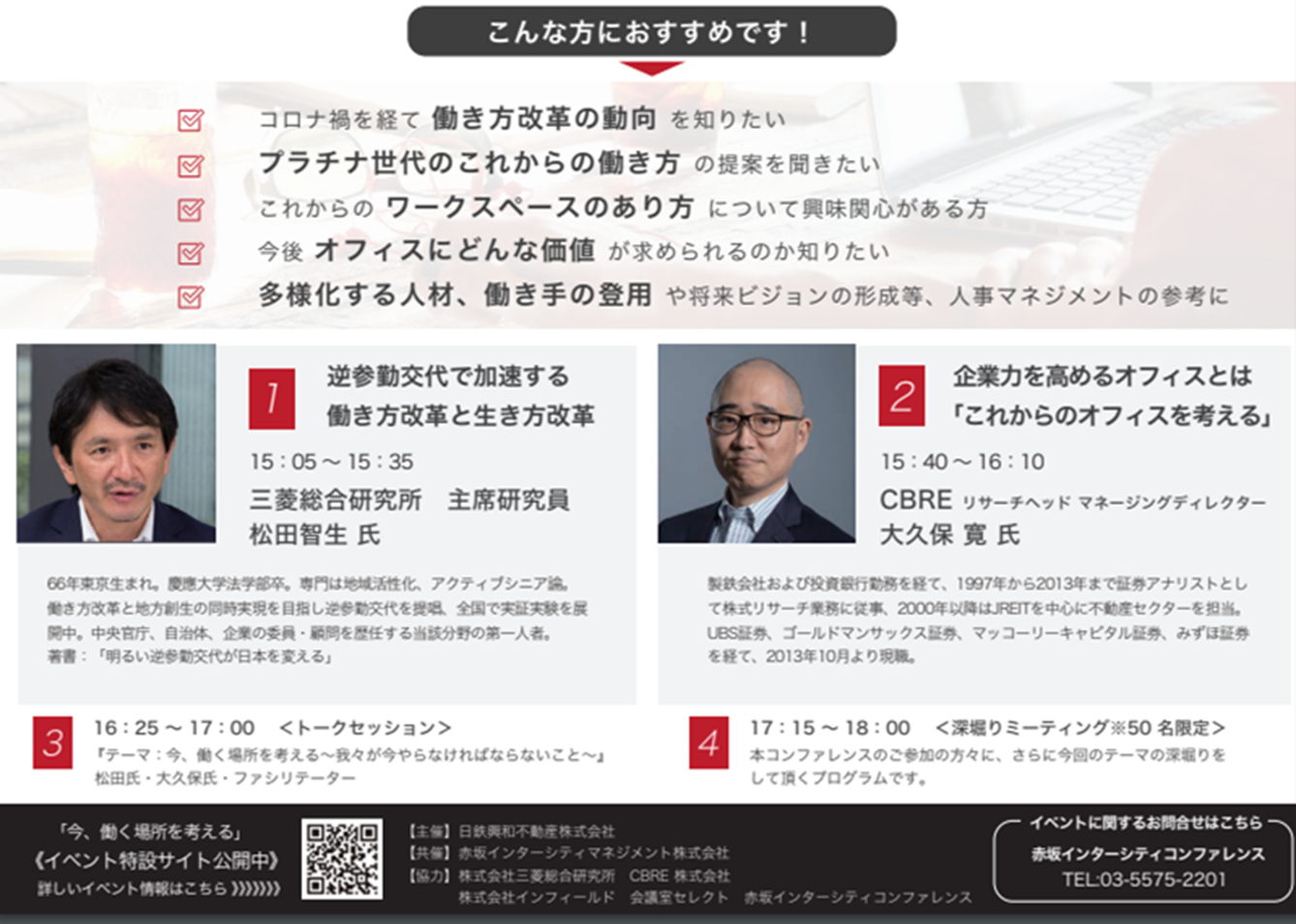 日鉄興和不動産株式会社(本社:東京都港区、代表取締役社長:今泉 泰彦)は「赤坂インターシティコンファレンス」におきまして、下記の通り、赤坂インターシティマネジメント株式会社(本社:東京都港区、代表取締役社長:塚田 佳志)との共催でコンファレンスフォーラム“赤坂 MAKES GOOD IDEAS” 『今、働く場所を考える』を開催いたします。