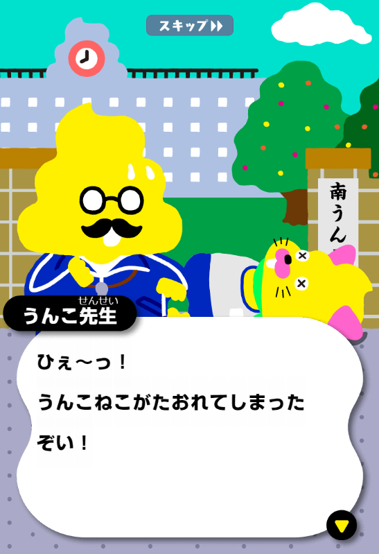 ゲームは、うんこドリルシリーズでおなじみのキャラクター・うんこねこが学校のマラソン中に倒れてしまうシーンから始まります。