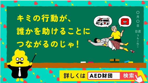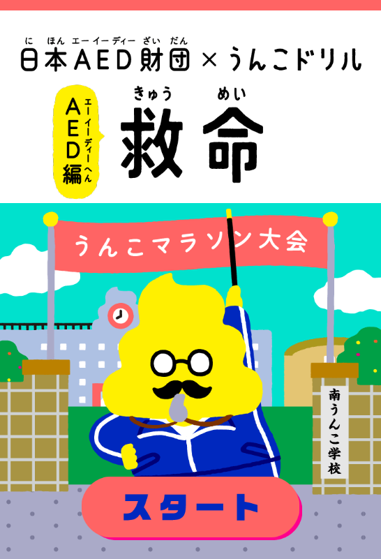 私たちの少しの知識と勇気で、AEDを活用して大切な命を救うことができることをより多くの人に知ってほしいという想いから、公益財団法人日本AED財団と累計1,000万部を突破し小学生に圧倒的な認知を誇る「うんこドリル」シリーズがコラボして制作したオンラインゲーム「うんこ救命ドリル(AED編)」と「うんこなぞかけ動画」。