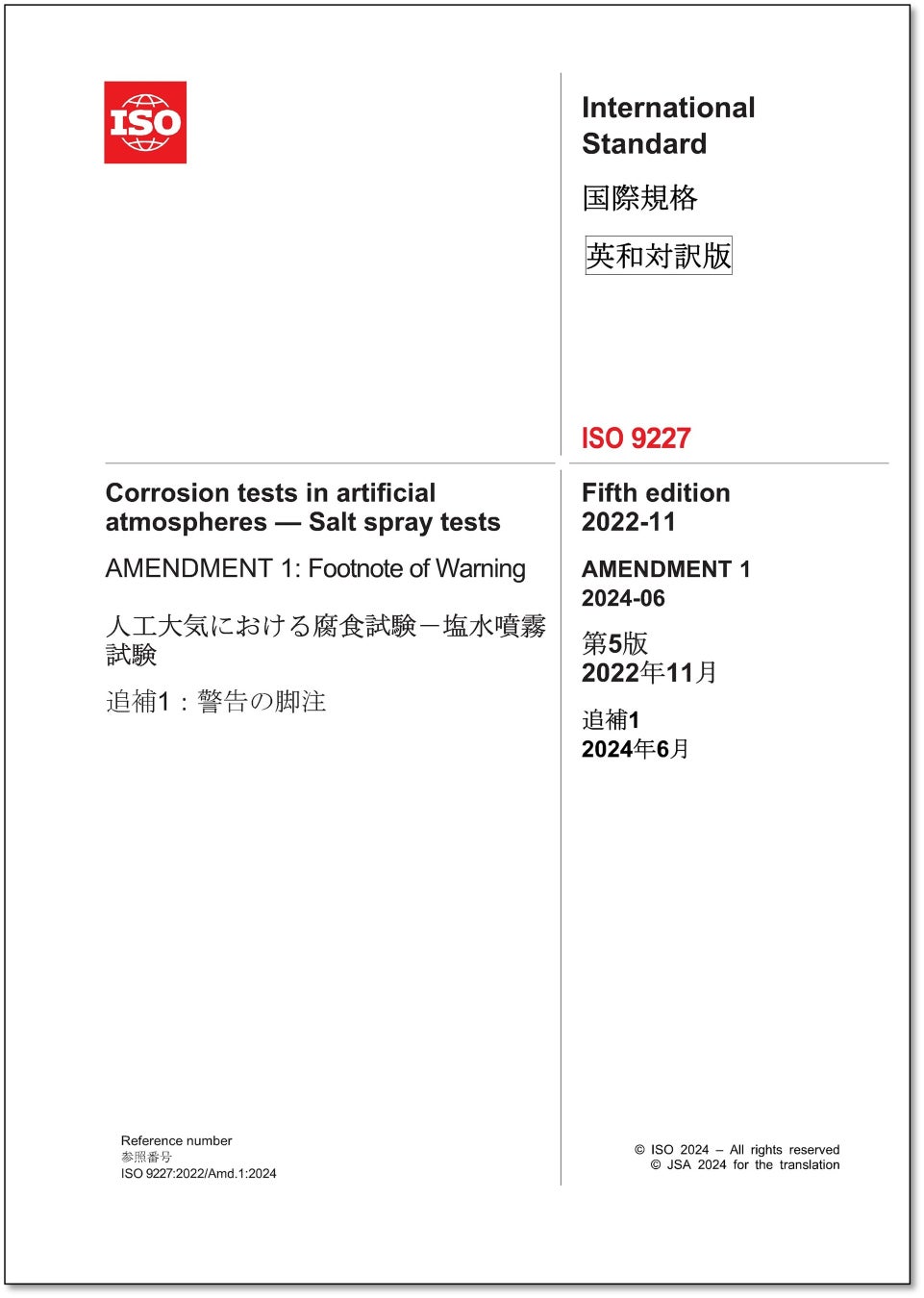 ● ISO 9227:2022/Amd 1:2024「人工大気における腐食試験-塩水噴霧試験-追補1:警告の脚 注」