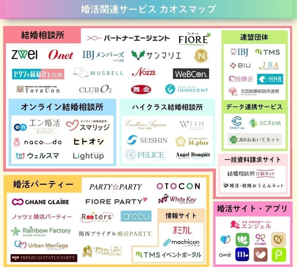 婚活用サービスの種類は、大きく分けて「結婚相談所」「婚活パーティー」「婚活サイト・アプリ」の3つです。本カオスマップは、婚活に関連する様々なサービスを3種類に区分しました。結婚相談所と婚活パーティーに関しては、サービス内容に応じてさらに細かく分類しています。