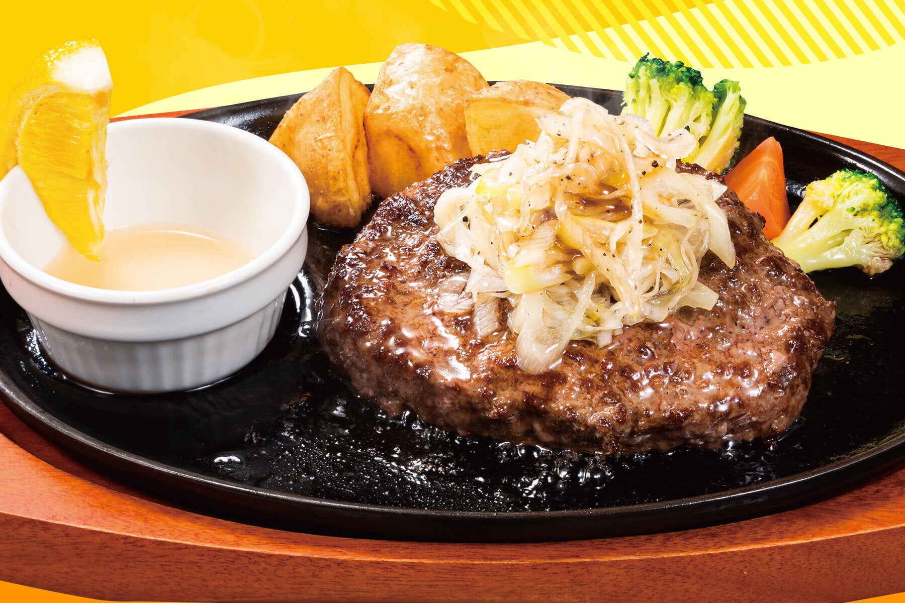 素材の弾力とうま味を楽しめる、コリコリ、ジューシーな新食感のハンバーグです。挽肉には牛タンのみを使用し、特長的な食感を残すように粗めに挽き、スパイスで風味を引き立てました。レモンと特製の塩だれで、さらに牛タンの旨みをご堪能いただけます。「ステーキのどん」のオリジナルハンバーグをぜひお楽しみください。