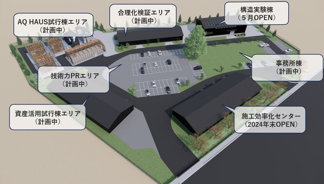 AQ Group本社には、基幹事業の注文住宅事業の他、リフォーム事業や分譲事業など、これまで分散していたグループ事業を集結。事業部間のシナジーを生み、事業拡大・拡張を図ります。また、本社ビルが建築された土地は、8000㎡を超える広大な敷地を保有。今後は本社ビル以外に研究施設や試行棟、モデルハウスなどを考案しております。これまで、実験や研究を行う場合は遠方に足を運び、時間と費用を費やしてきましたが、本社機能と研究施設を一体化した仕組みを作ることで、これまで以上に技術を磨きます。さらに今後、東名阪の支店にも同様の仕組みの拡大を図ります。