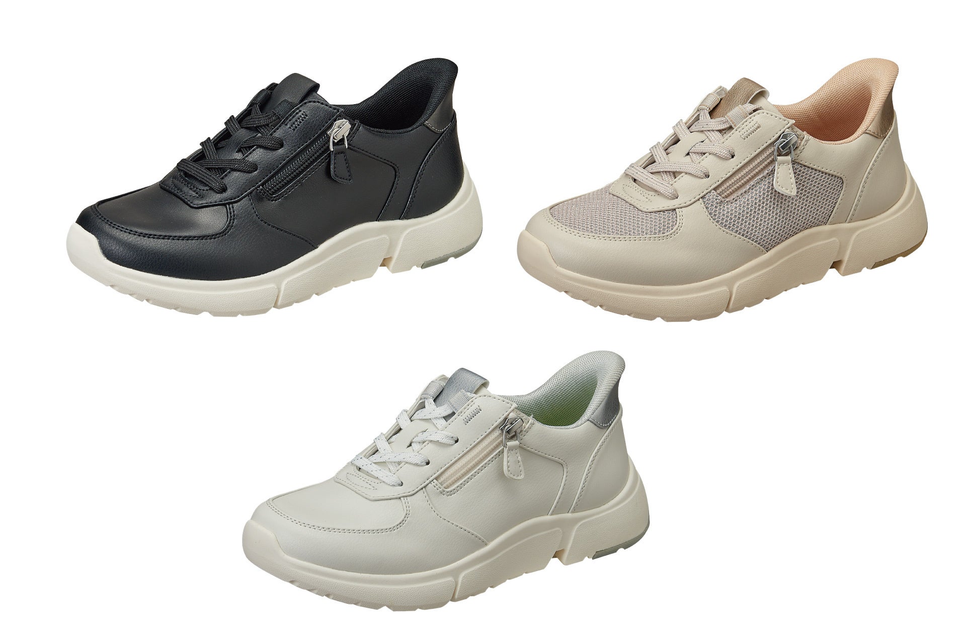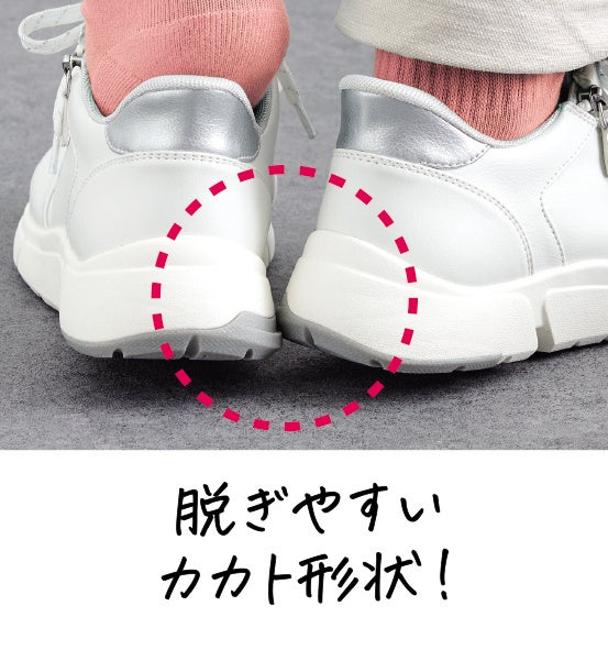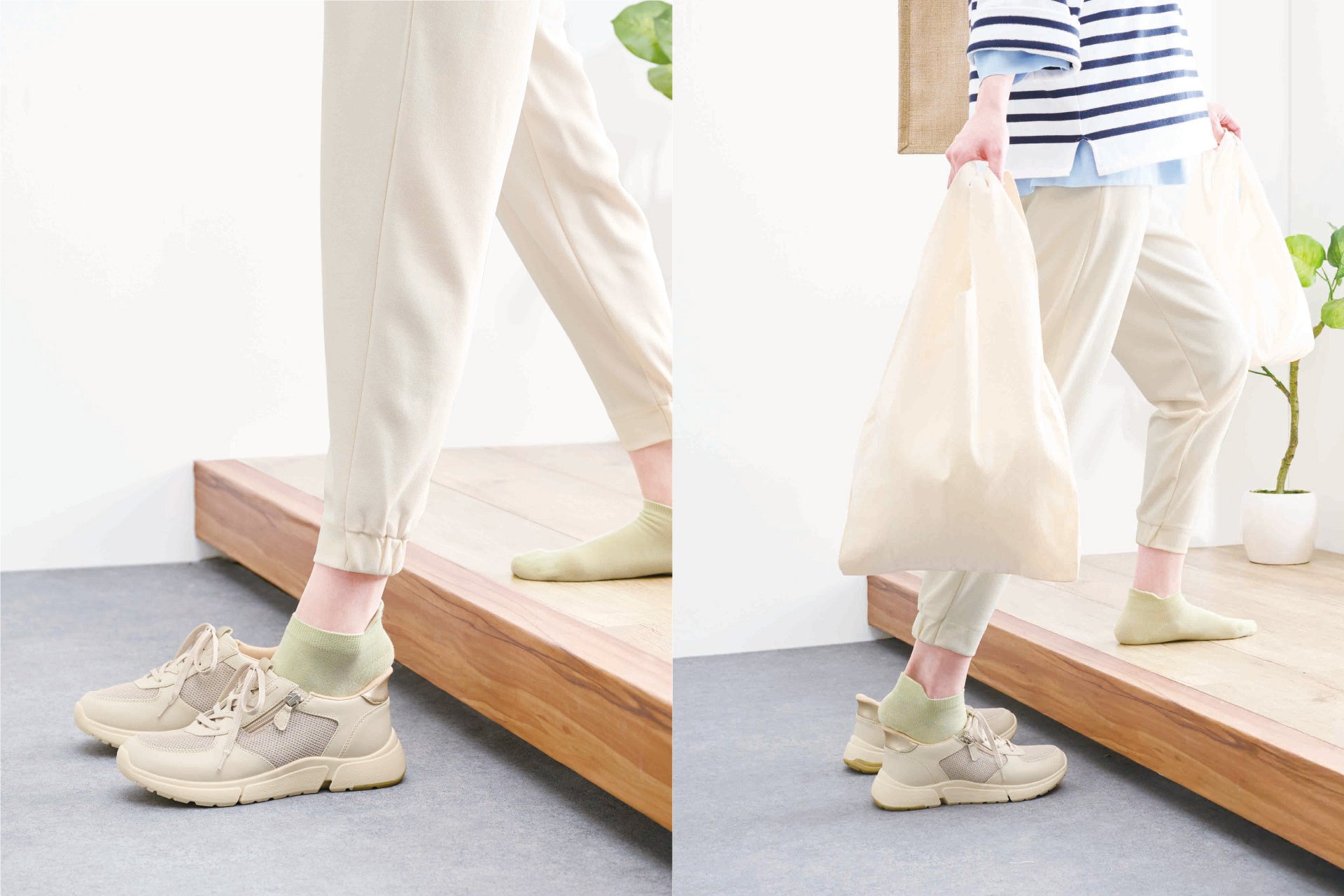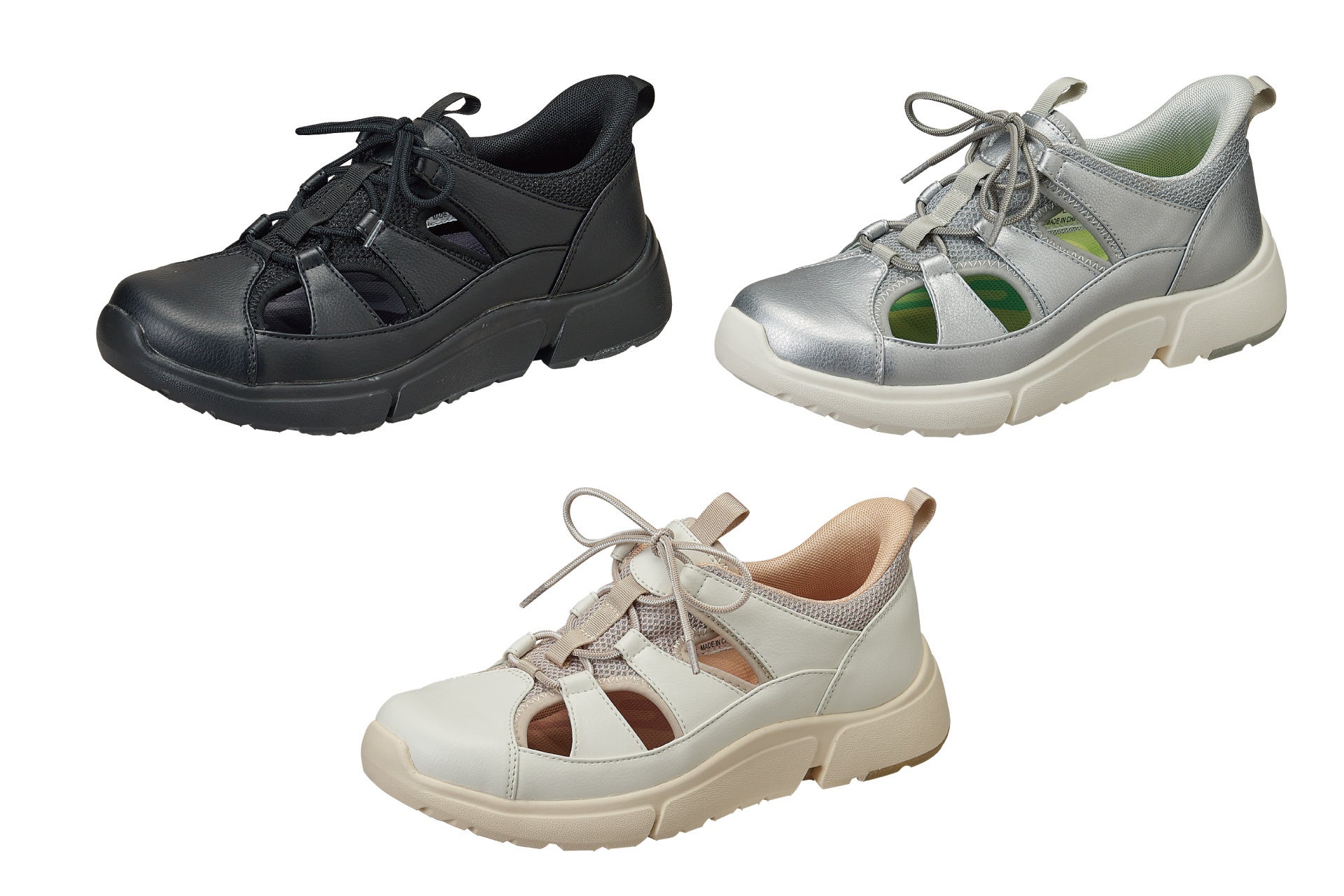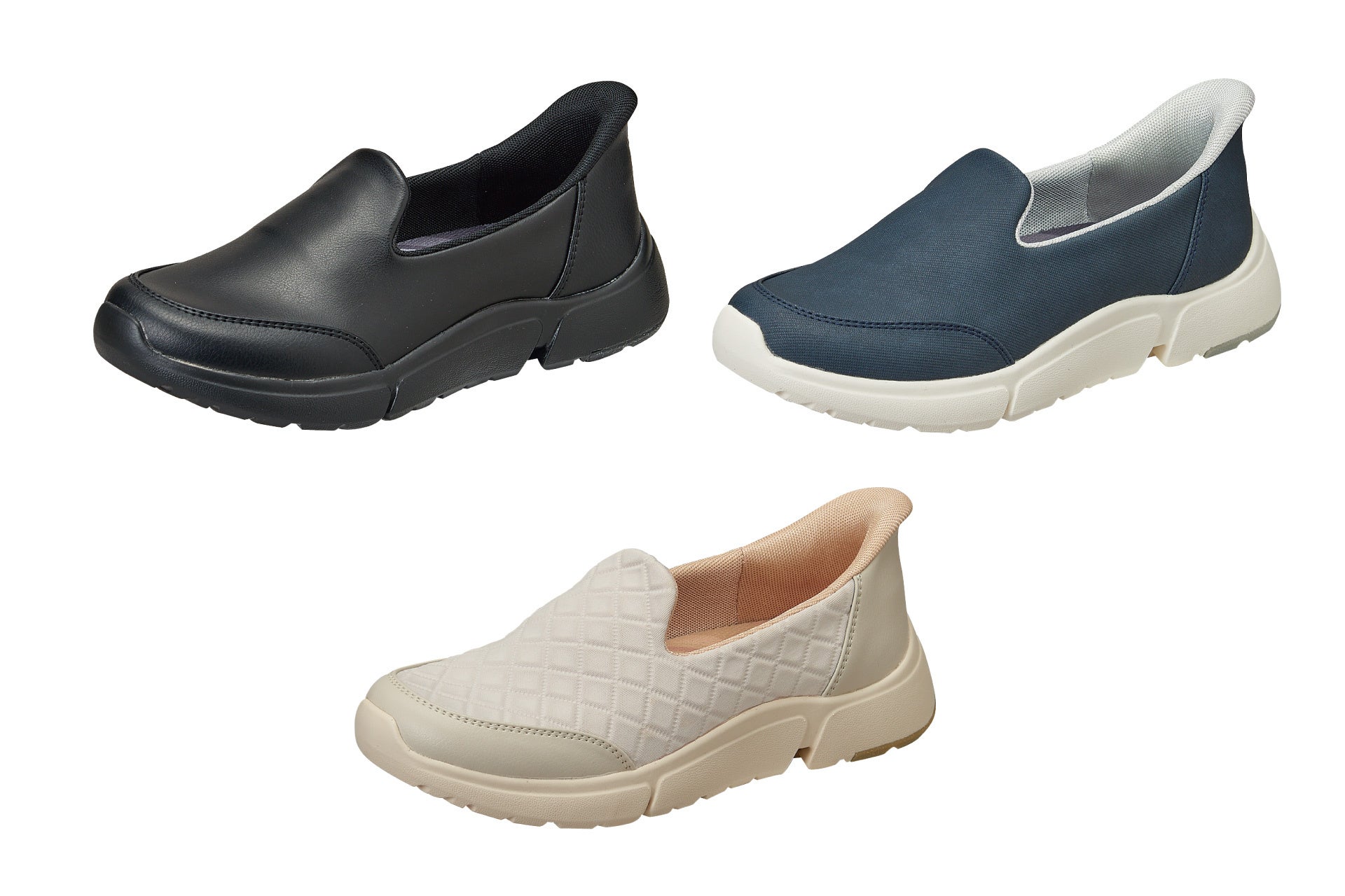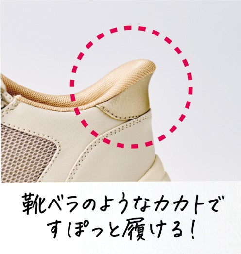 コロナ禍で設けられた様々な制限が撤廃・緩和され、近年コロナ禍前と同じように外出をしているミセス層を多く見かけるようになったことを受け、お買い物や旅行にぴったりな、歩きやすさはもちろん脱ぎ履きがしやすいスニーカーを開発しました。踵上部の靴ベラのようなハードカウンターが履きやすさをサポートします。さらに靴底の内側には靴を引っ掛けられる突起があるので脱ぎやすい仕様になっています。またミッドソールに衝撃を吸収する高反発弾性EVAを採用することで、クッション性がよく弾む履き心地を実現。長時間履いても負担を感じにくいスニーカーです。新作はシンプルなシューレースタイプ「EVE334」、スリッポンタイプ「EVE335」、春夏におすすめのオープンタイプ「EVE336」の3型で、税込6,600円のお手ごろ価格もうれしいポイント。脱ぎ履きが簡単なハンズフリー仕様なので急いでいるときや荷物が多いときに便利な1足です。
