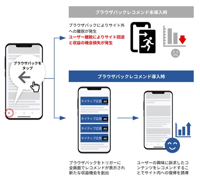 ブラウザバックとは、Webページを閲覧中に、ブラウザの「戻る」操作で直前に開いていたページに遷移することを意味します。外部サイトからユーザーが来訪した際、期待した内容のコンテンツでない場合などにブラウザバックによる離脱が発生します。離脱アクション直前に、ユーザーに興味のあるコンテンツを「Recommend Widget」で表示させることで離脱を防ぎ、滞在を維持して回遊へ転換させるためのソリューションとして、新広告フォーマット「ブラウザバックレコメンド」を開発しました。