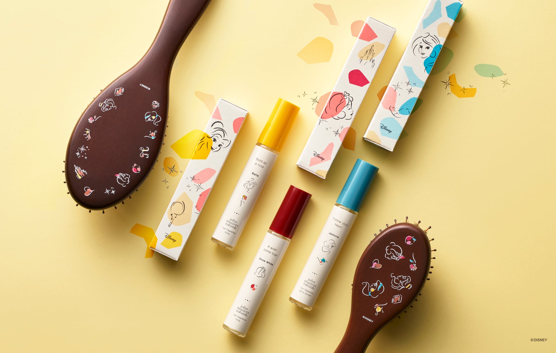 3人のディズニープリンセスをイメージして調合した特別な香りのオイルインヘアフレグランス。ネーミングは、それぞれの劇中に出てくる印象的なセリフや歌詞のフレーズをモチーフにしたオリジナルです。フルーティな香りの中に、白雪姫の純粋で真っすぐな美しい心を表現した「A wish come true ~願いは叶う~」。スパイシーでウッディな香りでジャスミンの自由への憧れを表現した「Follow your heart ~心のままに~」。甘くみずみずしいフローラルな香りで、聡明で好奇心旺盛なベルが時折見せる大胆なまでの意志の強さを表現した「Bold as a rose ~薔薇のように大胆に~」というように、製品やデザインを通じてそれぞれのキャラクターのイメージや物語の世界観をお楽しみいただけます。