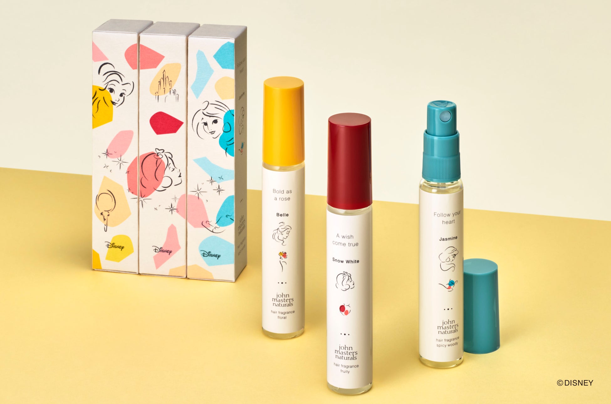 3本のヘアフレグランスをセットにしたギフトボックスもディズニープリンセス限定デザインで登場。ギフトアイテムとしてはもちろん、自分へのご褒美アイテムとして、その日の気分やシチュエーションに合わせて香りをお楽しみいただけます。
