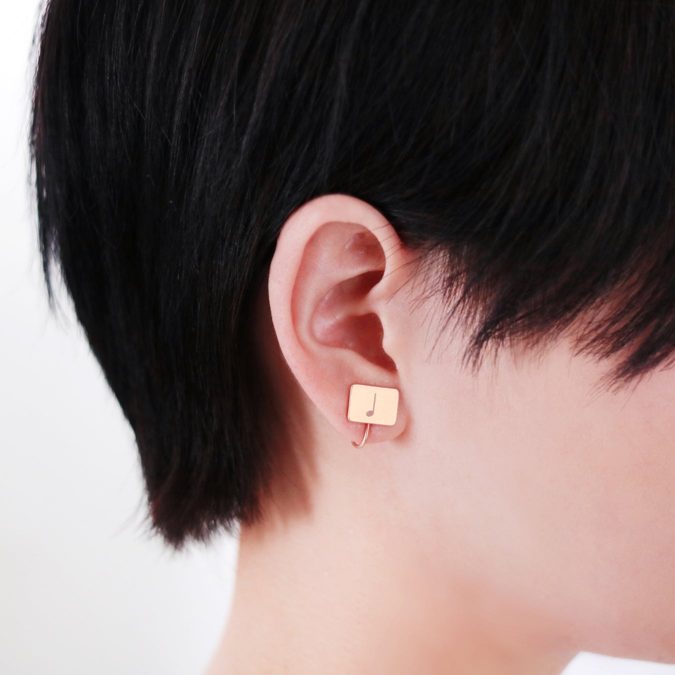 無限に付点がついた音符をデザインしたプレート型のイヤリングです。片方には四分音符が、もう片方には付点が無限個ついた八分音符がデザインされています。実はどちらも、同じ長さの音符を表しています。