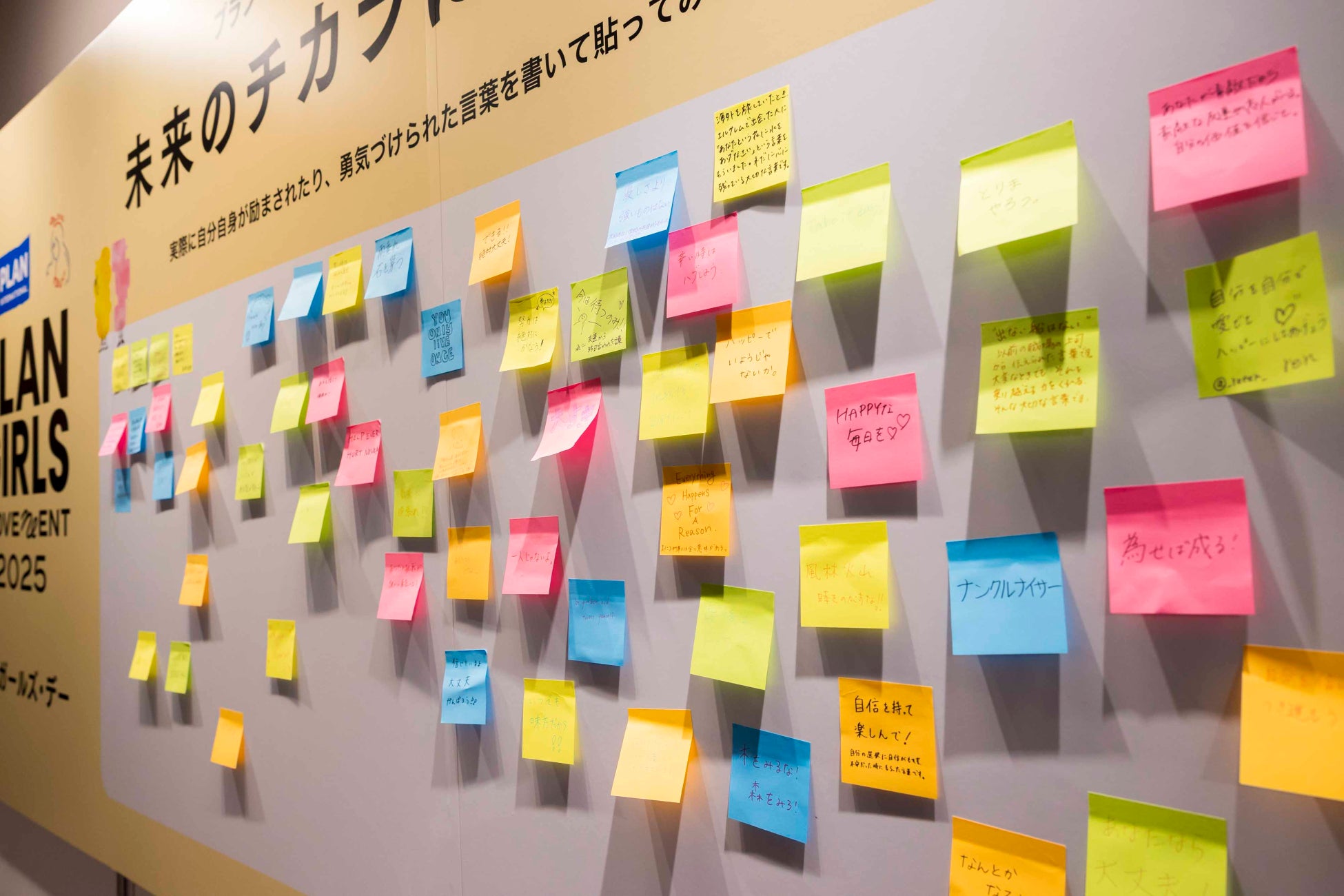 会場内に設置されたメッセージボードには、イベントのゲストが手書きした来場者に向けての「未来のチカラになる言葉」を掲出。来場者にもイベントの感想、誰かに伝えたいメッセージなどを自由にご記入いただくことで、イベントに参加した全員が言葉で繋がる作品を共作しました。