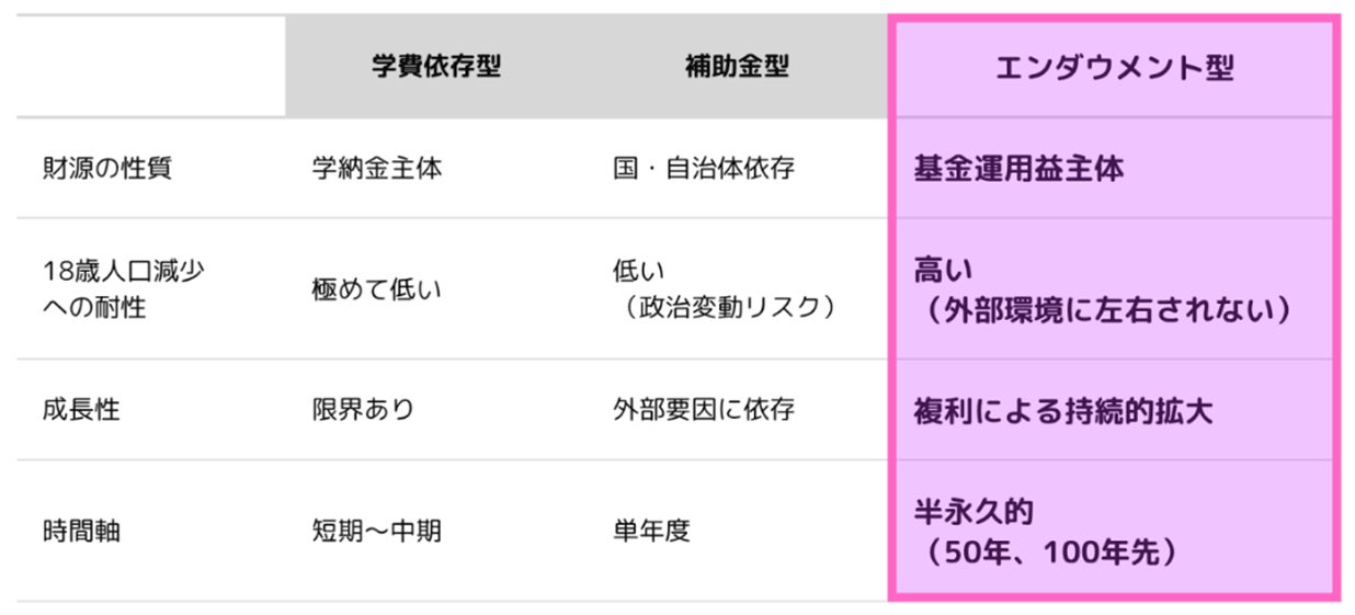 基金の目的:学園の永続的な発展のための持続可能な財源とすべく運用益を再投資して早期の規模拡大