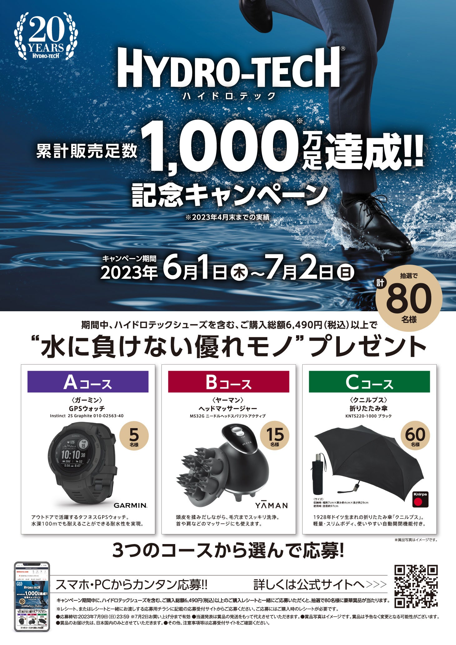 株式会社チヨダ(東京都杉並区 代表取締役社長 町野 雅俊)は、プライベートブランド「HYDRO-TECH(ハイドロテック) 」の累計販売足数が1,000万足を達成(※)した記念として、全国の店舗と公式オンラインショップ「kutsu.com」にて、豪華グッズが抽選で80名様に当たる「HYDRO-TECH ~ハイドロテック~累計販売足数 1,000万足達成 !! 記念キャンペーン」を開催いたします。※ 2023年4月末までの実績