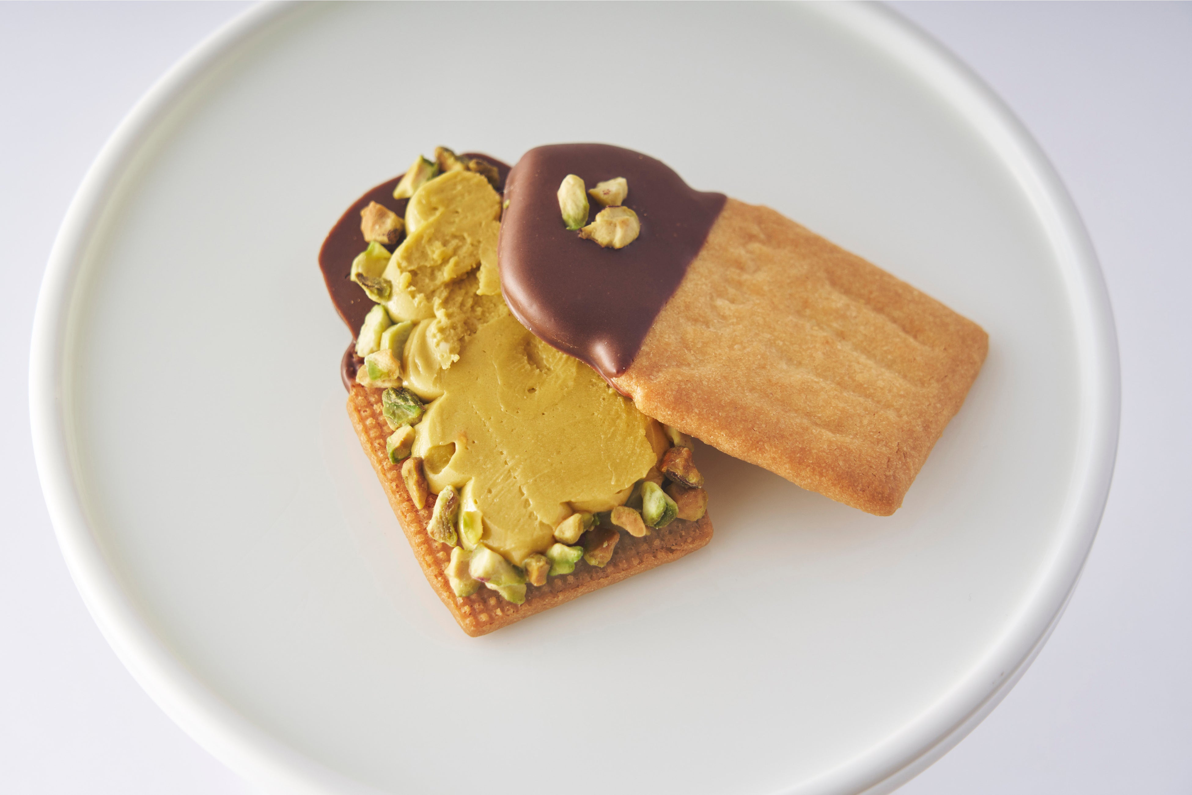 生クリーム入りのバタークリームに高品質なイタリア製ピスタチオペーストをたっぷりと混ぜ合わせ、ミルクチョコレートをかけたビスケットで挟みました。砕いたピスタチオナッツも加え、ピスタチオの味わいとナッツのユニークな食感がたのしい贅沢生バターサンドです。砕いたピスタチオナッツは丁寧にローストして香ばしさをアップ。ナッツ本来の風味と生バタークリームのコクで、より味わい深く最後まで飽きずに楽しめる逸品です。
