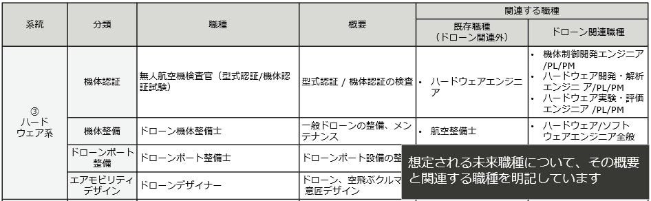 さらに、本キャリアマップの各系統に配置される「未来職種」は「未来職種一覧」(資料3)を確認することで、その職種の内容とドローン人材の将来的なキャリアの広がりをご覧いただくことが可能です。
