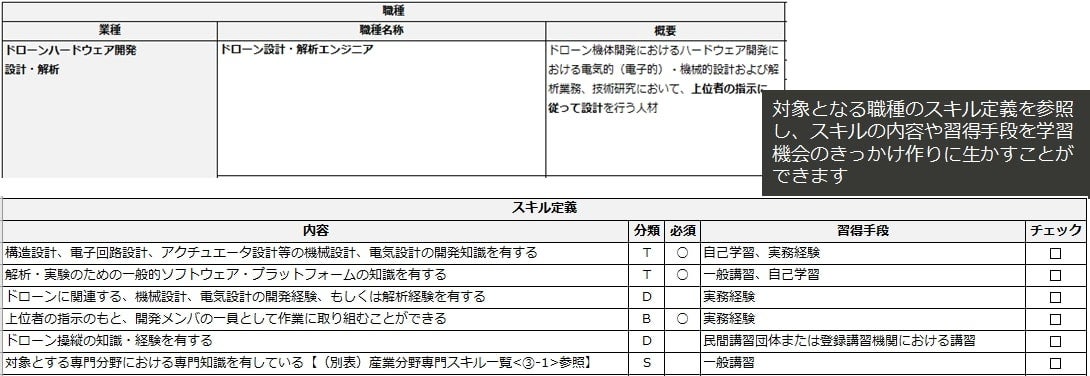 まず、本キャリアマップ(資料1)にて、「既存職種」あるいは業務領域に当てはまる系統から「ドローン関連職種」「未来職種」を参照します。次に、「職種要件定義表」(資料2)から、必要なスキル定義の内容や習得手段を確認することで、学習機会のきっかけや人材要件の整理に活用できます。また、職種要件定義表内では、同業種内でのキャリア段階に応じたスキル要件を確認することができるため、長期的なキャリアアップの検討にも活用することができます。