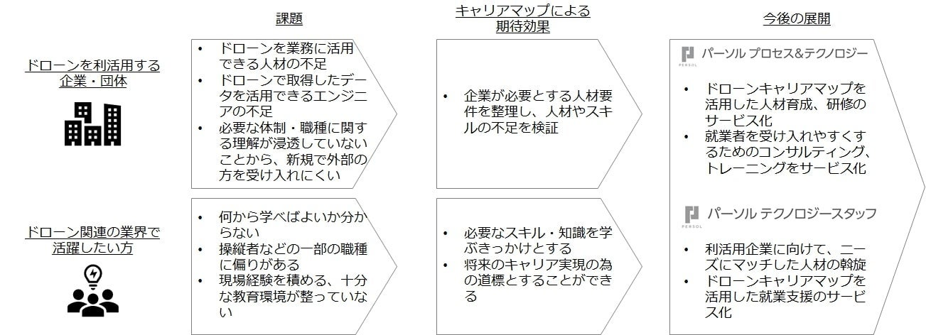 このような課題に対して、自治体や企業に対してドローンの活用支援を行うパーソルP&Tとドローン人材の派遣ビジネスを展開するパーソルテクノロジースタッフ、および、PwCコンサルティングが共同で、企業やはたらく個人が利用できる「ドローンキャリアマップ」を作成し、公開しました。