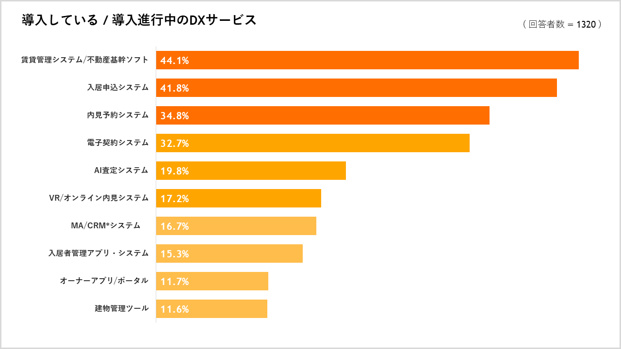 現在導入中または導入進行中の不動産テックシステムについて質問したところ「賃貸管理システム(不動産基幹ソフト)」が最も多く44.1%、次いで「入居申込システム」が41.8%、「内見予約システム」が34.8%、「電子契約システム」が32.7%でした。