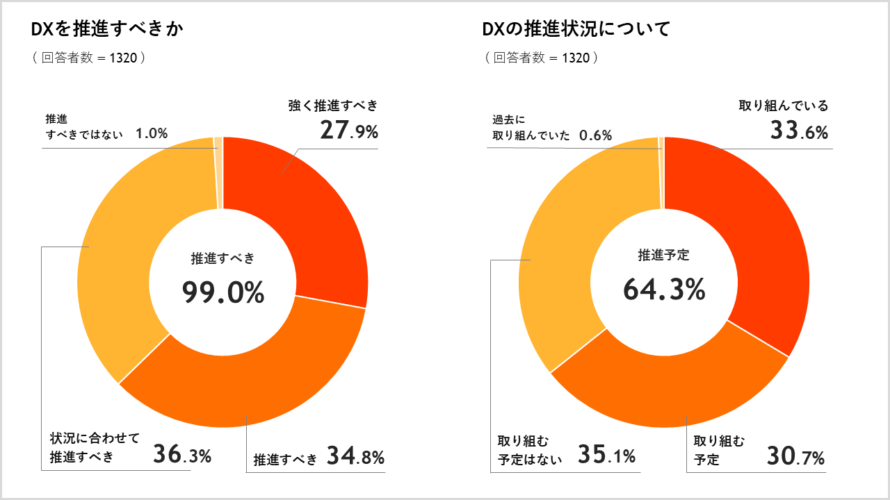 「DXを推進すべき」の回答は99.0%で過去最高、「DXに実際に取り組んでいる/いた・予定」が64.9%