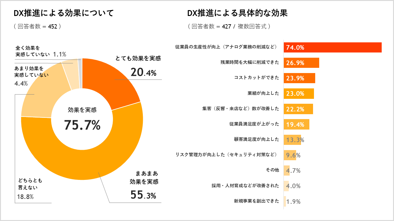 「DXに取り組んでいる/いた」と回答した人へ、DXの効果について質問したところ、「とても効果を実感している」は20.4%、「まあまあ効果を実感している」は55.3%と、合計75.7%が効果を実感。具体的な効果は「従業員の生産性が向上」が74.0%、「残業時間を大幅に削減できた」が26.9%、「コストカットができた」が23.9%でした。