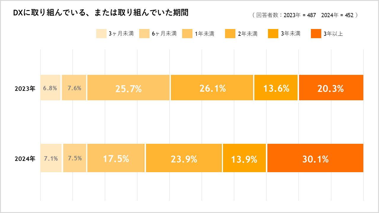 DXの取り組み期間が「3年以上」と回答した企業の割合が昨年と比べて約10%増加、目的は「業務効率化」「生産性向上(稼働率アップ)」「顧客満足度アップ」など