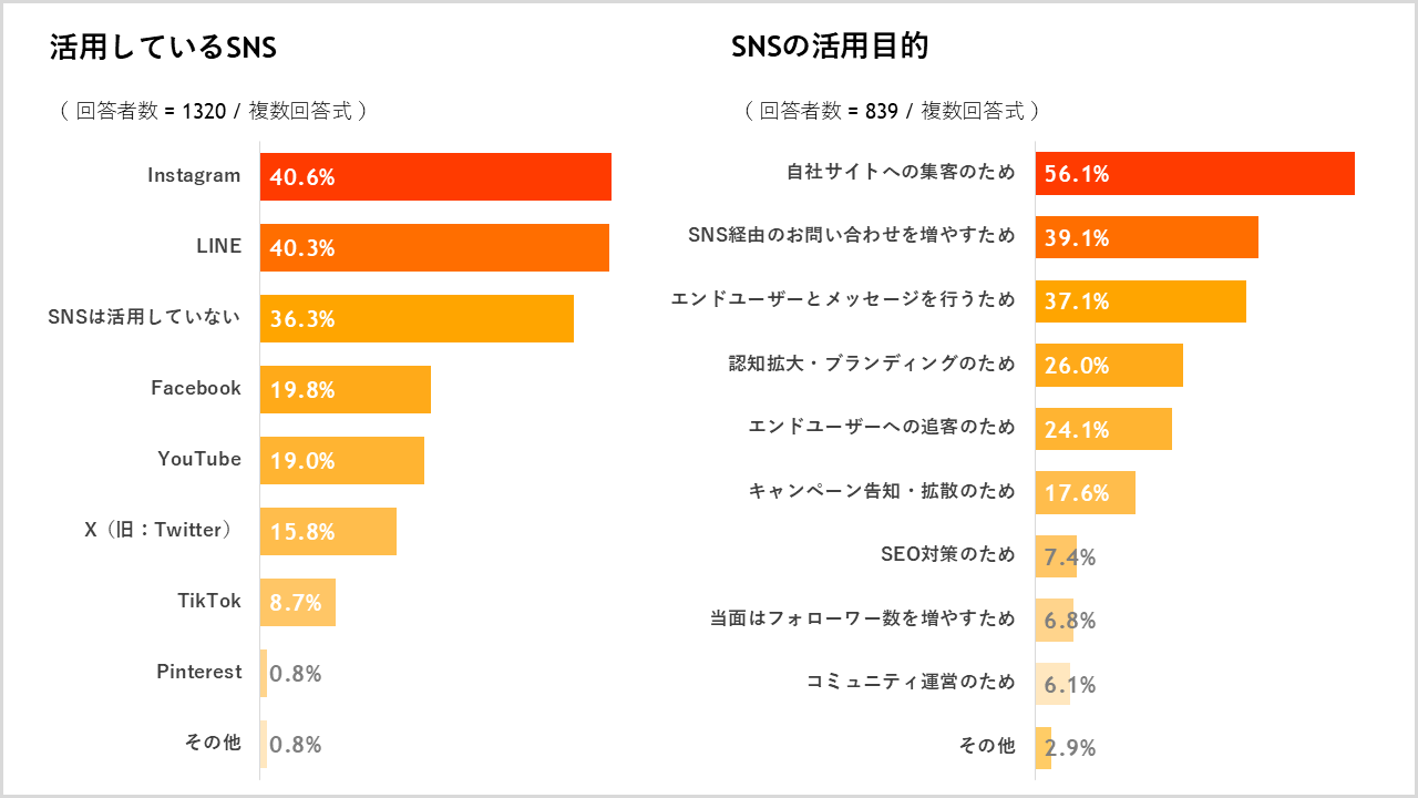 業務で活用しているSNSについて質問したところ、「Instagram」が40.6%、「LINE」が40.3%でした。活用の目的は「自社サイトへの集客のため」が56.1%、「SNS経由のお問い合わせを増やすため(物件への問い合わせDMなど)」39.1%と、多くの目的はエンドユーザーとの接点を増やすことだと窺えます。