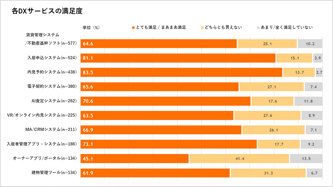 導入中の不動産テックサービスの満足度について質問したところ、「とても満足している/まあまあ満足している」の回答が最も高かったのは「内見予約システム」で83.5%、次いで「入居申込システム」が81.1%、「入居者管理アプリ・システム」が73.1%、「AI査定システム」が70.6%でした。