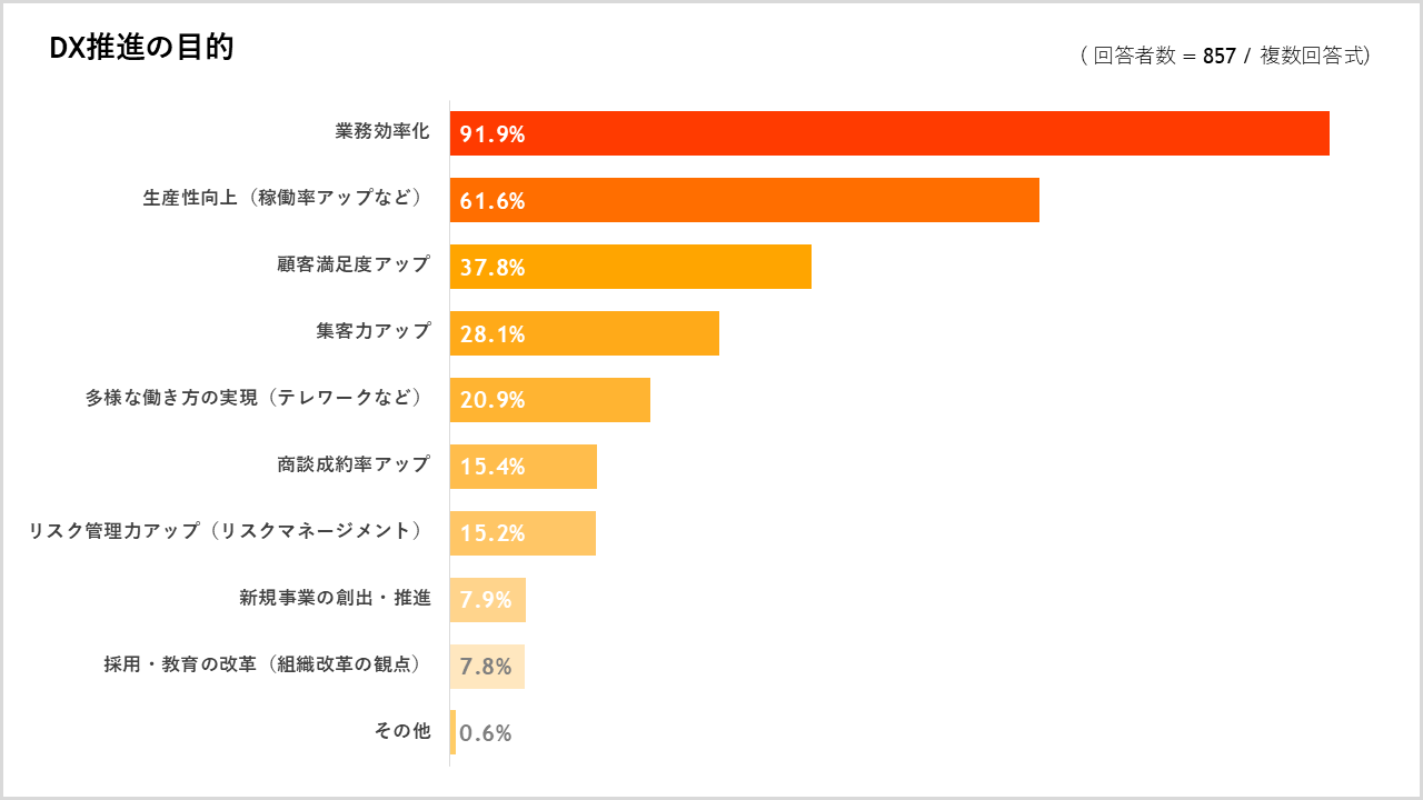 DXに取り組んでいる期間について質問したところ、「3年以上」が30.1%で、昨年と比較し割合が約10%も増加しました。1年以上取り組んでいる企業を合計すると67.9%と、DXに継続的に取り組む企業が増えています。また、DX推進の目的は、「業務効率化」が最も多く91.9%で、次いで「生産性向上」が61.6%、「顧客満足度アップ」が37.8%でした。