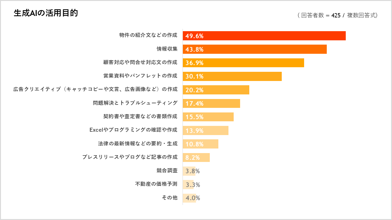 生成AIを18.0%が「業務で活用している」と回答、中でも約9割が活用している「ChatGPT」は「物件の紹介文などの作成」などに利用