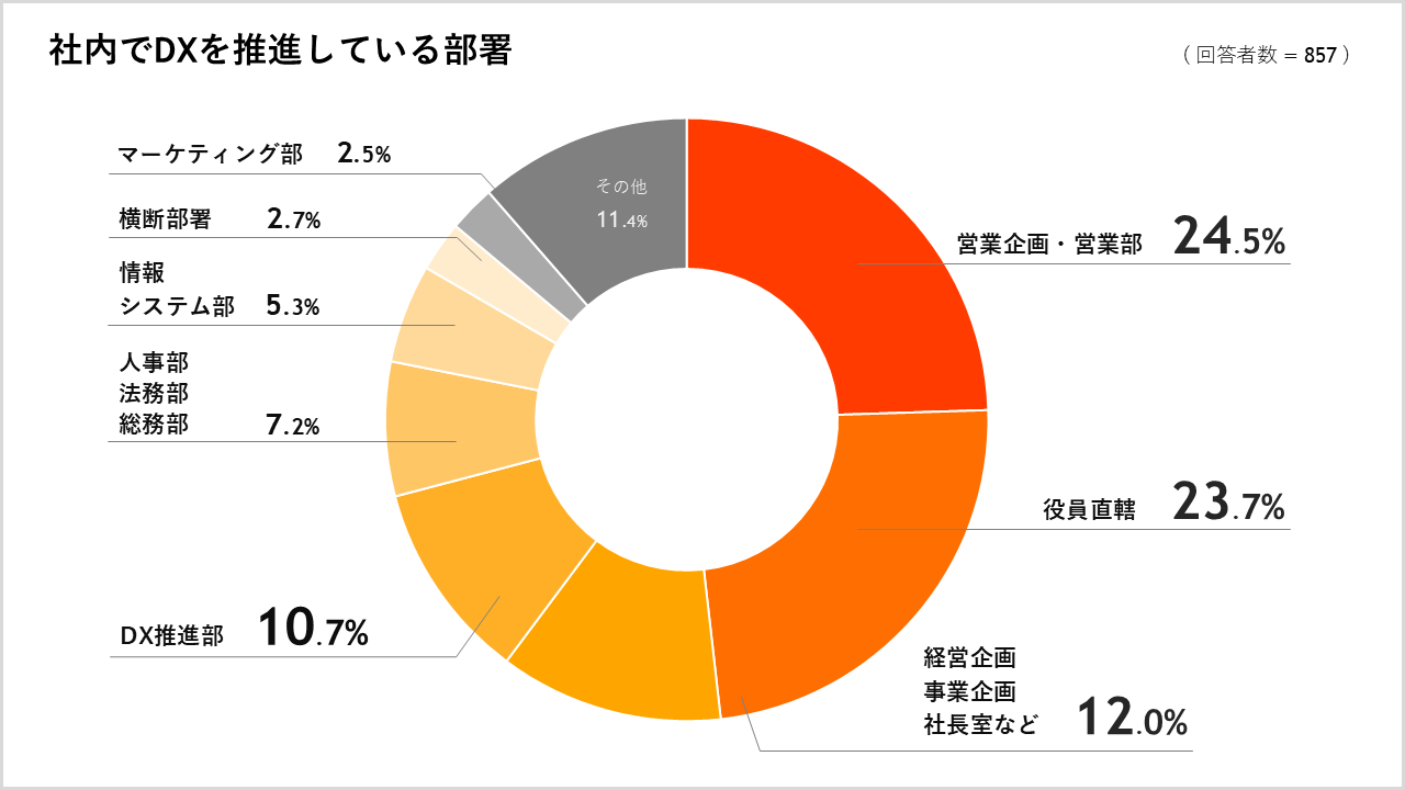 現在DXに取り組んでいると答えた人に対し、DXを推進している部署について質問したところ、「営業企画・営業部」が24.5%が最も多く、次いで「役員直轄」が23.7%、「経営企画・事業企画・社長室など」が12.0%でした。