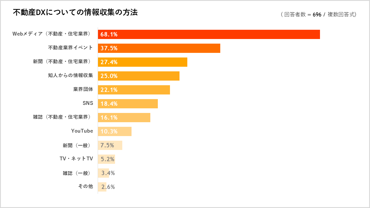 不動産DXについて情報収集しているか質問したところ、「頻繁に情報収集している」は14.3%、「たまに情報収集している」は62.3%。また、どのように情報収集しているか質問したところ、回答が最も多かったのは「Webメディア(不動産・住宅業界)」で68.1%、次いで「不動産業界イベント」が37.5%、「新聞(不動産・住宅業界)」が27.4%でした。昨年と比較すると、紙メディアよりもWebメディアで情報収集される人の割合が増加しています。また、「知人からの情報収集」「業界団体」の回答も多く、業界内での横の繋がりを活かし、情報収集をしていると考えられます。