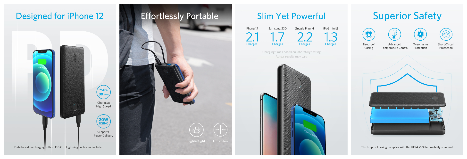 また、女性でもスマートフォンと重ねて持てる薄型設計が魅力の「Anker PowerCore Slim 10000 PD」も同様にiPhone 12シリーズを最適な速度で充電できるようアップグレードを図りました。「Anker PowerCore Slim 10000 PD 20W」は約1.5cmの超薄型設計ながら、10000mAhの大容量バッテリーに加え、USB PDに対応したUSB-CポートとAnker独自技術のPowerIQを搭載したUSB-Aポートの2ポートを備えています。