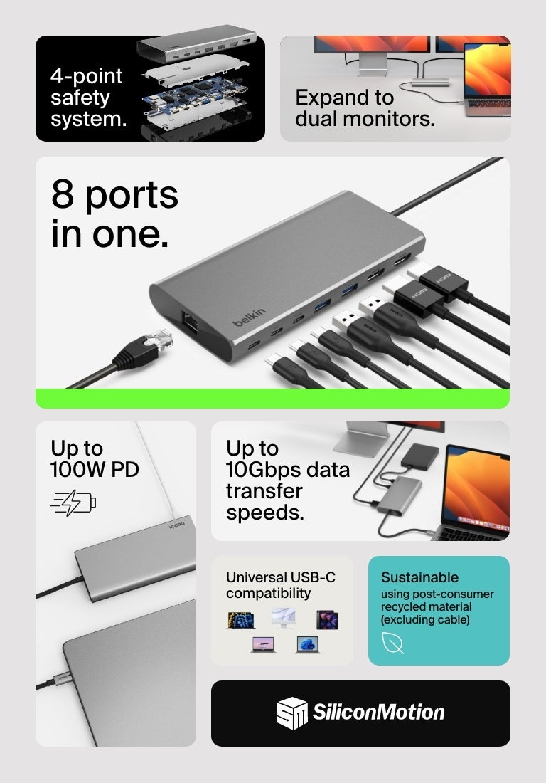 米カリフォルニア発、洗練されたデザインと快適なライフスタイル体験を提案し、グローバルで絶大な人気と市場シェアを誇るスマートフォン・PC関連製品ブランド「Belkin」の日本法人、ベルキン株式会社(以下Belkin、所在地:東京都中央区京橋)は、2つのHDMIポートでM1/M2/M3 Macでデュアル4K出力をサポートし、USB-Cポートも3口搭載したUSB-Cハブ「Belkin Connect 8-in-1 Dual 4K Display USB-C コア ハブ」を6月18日(火)より全国の家電量販店及び Amazon.co.jp にて販売を開始いたします。
