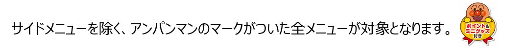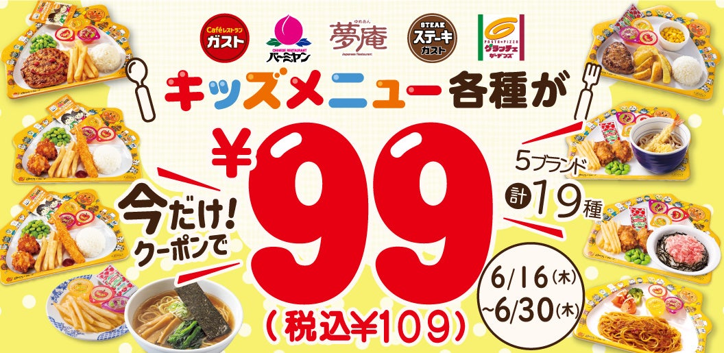 | 【キッズメニュー各種がお得になるチャンス!】 アンパンマンマークの商品(サイドメニューを除く)が、クーポンで99円(税込109円)に ガスト・バーミヤン・夢庵・ステーキガスト・グラッチェガーデンズで、ご利用いただけます。 <キッズ99円(税込109円)キャンペーンURL:https://www.skylark.co.jp/kids99cp/index.html> |