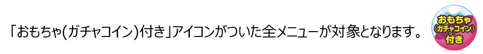 | 【“妖怪ウォッチ♪”のキャラクターが妖怪図鑑シートになって登場】 「おもちゃ(ガチャコイン)付き」アイコンがついた対象商品ご注文で、もれなくゲット!(※) ガスト・バーミヤン・しゃぶ葉・ジョナサン・夢庵・ステーキガストにて、配布いたします。 <妖怪ウォッチ♪キャンペーンURL:https://www.skylark.co.jp/yo_kai_watch/index.html> ※テイクアウト・宅配では、ブランドにより対象メニューやカプセルトイの付属有無が異なります |