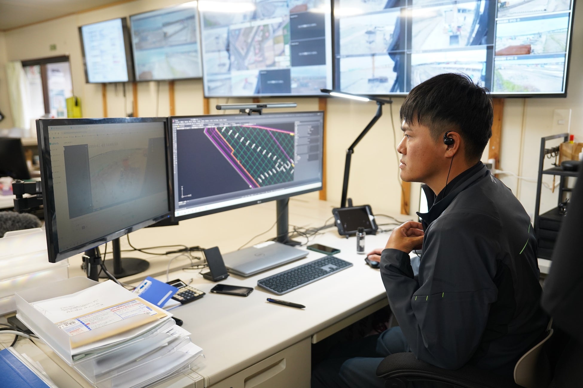 所長や現場監督は重機に設置した「Safie Pocket2 Plus」の映像を介し、事務所から遠隔で現場状況を把握、耳に付けたBONXデバイスで瞬時にコミュニケーションを行っています。これにより、通常1名では目を配ることができない範囲までの現場管理を実現し、通常業務を事務所から遠隔でリアルタイムに実施できる状況を作り出せました。