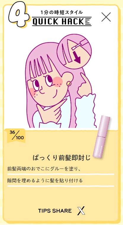 あほ毛を抑えるといった定番の使い方はもちろん、前髪の束感づくりや襟足の整え方など、日常の様々なシーンで活躍する裏ワザを、「エスターバニー」たちの世界観とともにイラストで紹介。