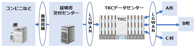 TKCデータセンターに構築されたサービス環境(市区町村とコンビニエンスストア等に設置されたマルチコピー機をつなぐ環境)を共同で利用するため、市区町村が単独で環境を構築する場合と比べて導入・運用・保守にかかる労力やコストが軽減されるとともに、短期間でコンビニ交付サービスをスタートできます。