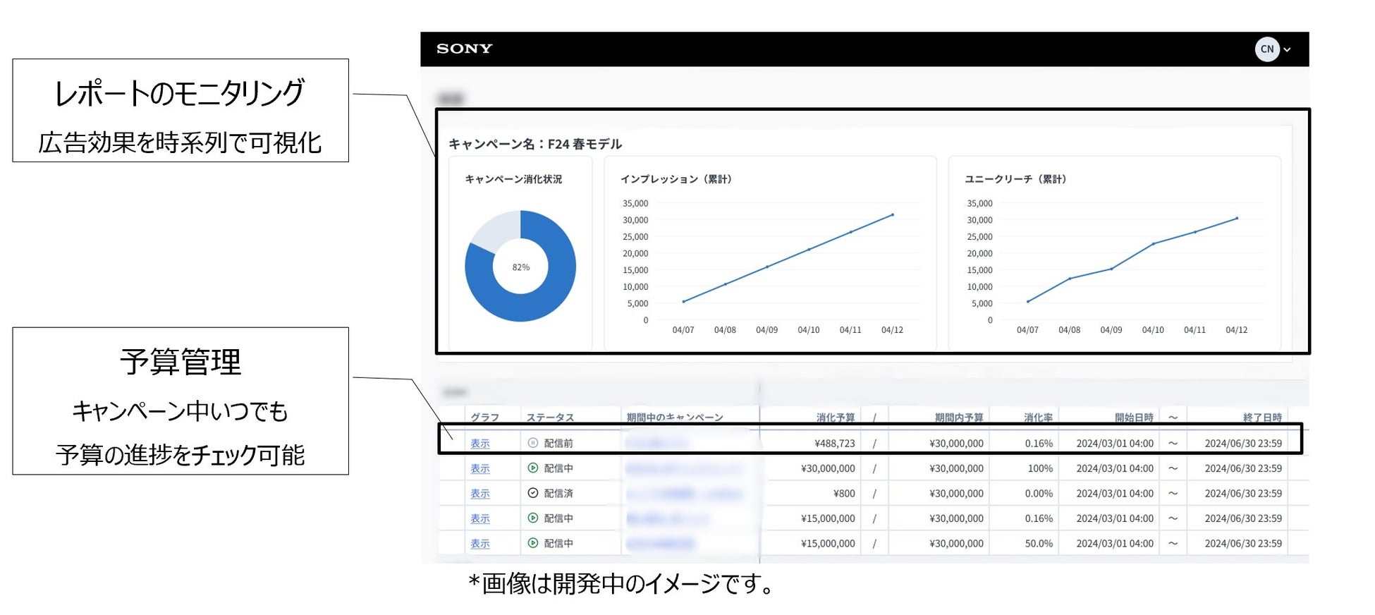 「BROAD+」は、テレビCMの出稿効率化と広告効果の最大化を目的とした広告配信サービスです。オンライン取引により、テレビCM出稿の運用をより手軽にするとともに、ソニーが保有、管理するテレビ視聴データを活用したテレビCMの出稿効果分析サービスを提供することで、より効果的な広告出稿をサポートします。広告効果のデータをオンライン上で随時確認できるため、より広告効果が高い出稿枠を選定したり、キャンペーン期間内に出稿枠を再調整し、より効果の高い入札を目指したりするなど、柔軟なプランニングと運用を実現します 。