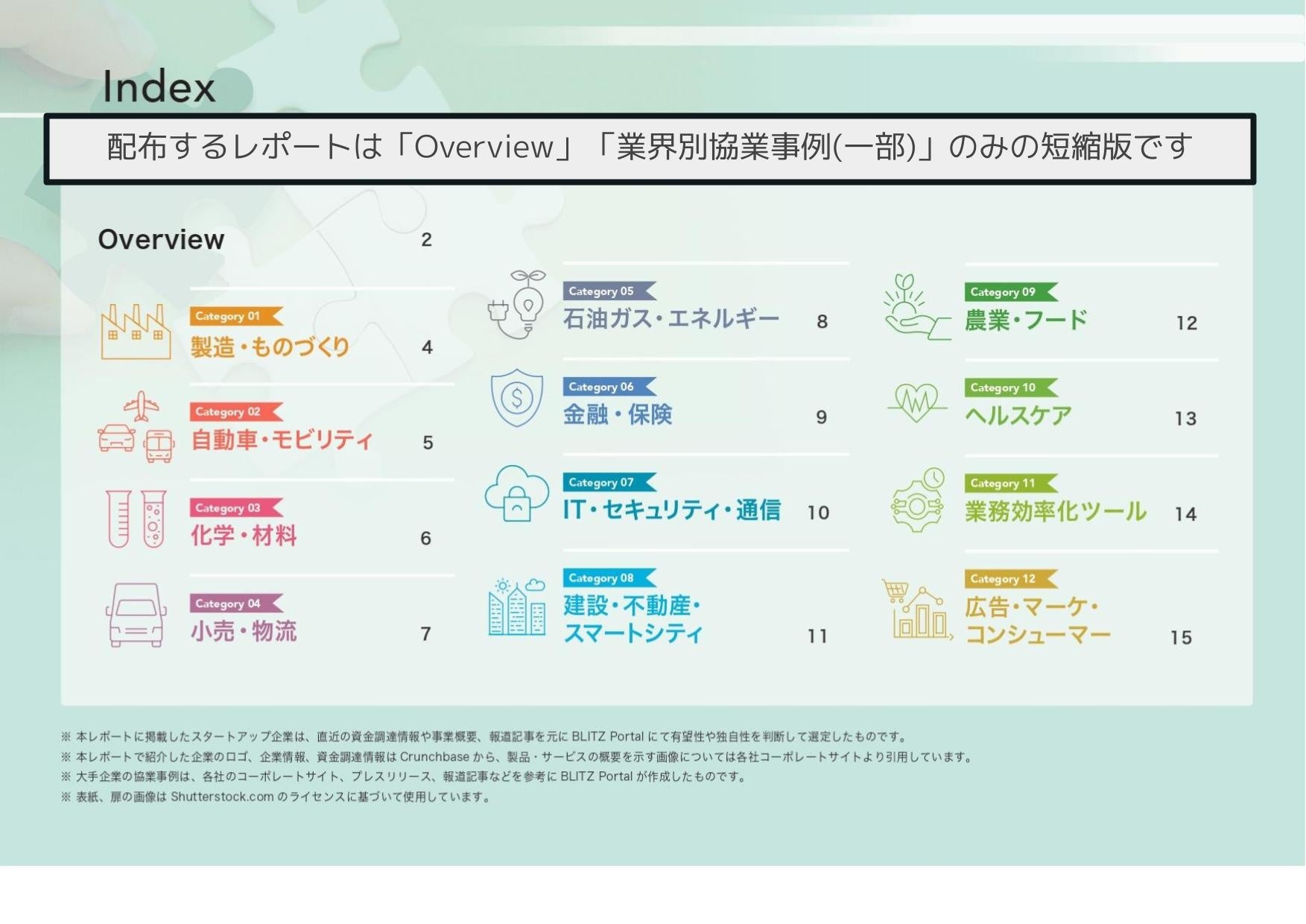 本レポートでは、2023年後半から2024年前半にかけて発表された、共同研究開発や実証実験、導入、出資など、国内外の大企業とスタートアップとのさまざまなオープンイノベーションの事例を、12の業界別にご紹介します。