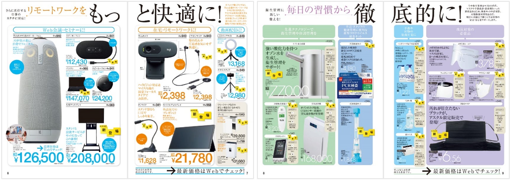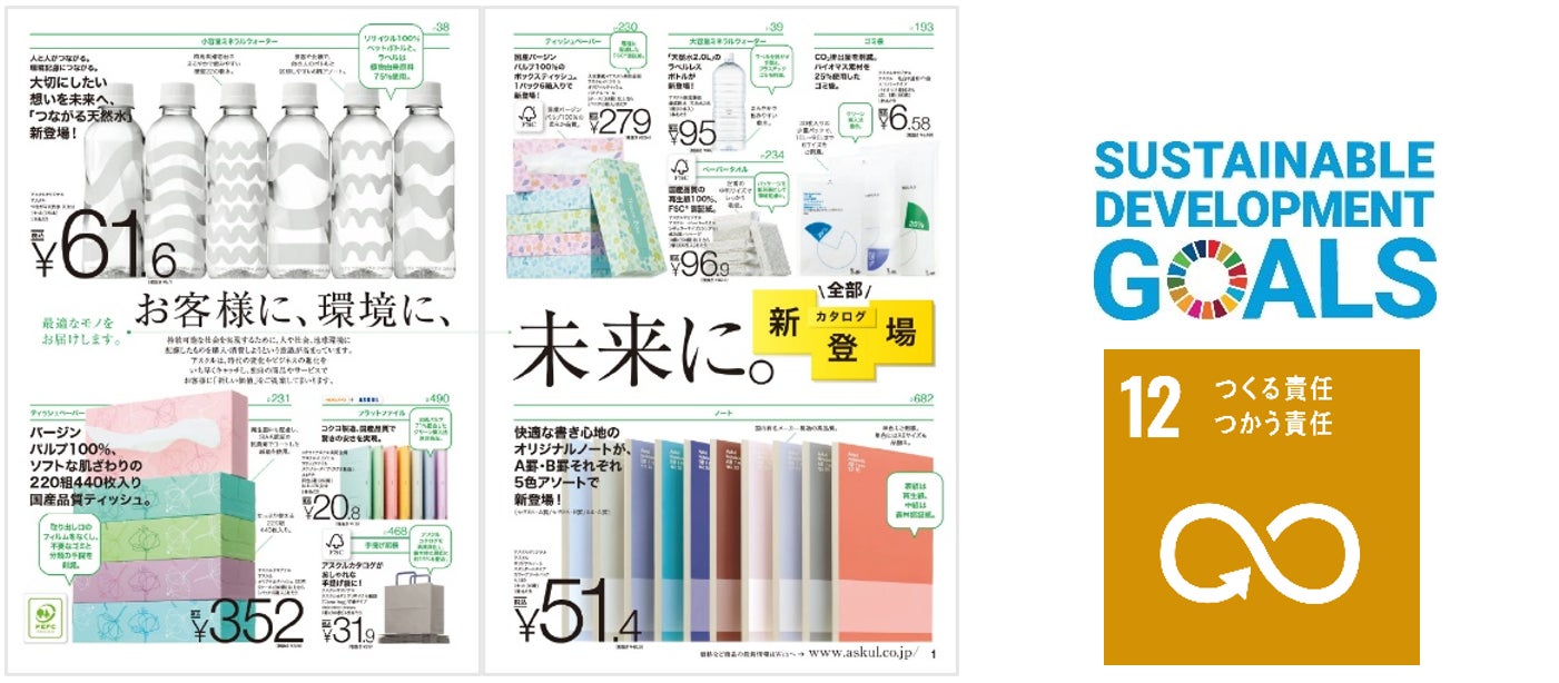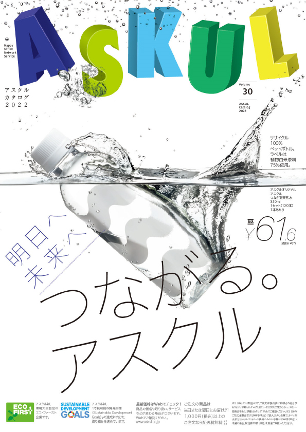 新型コロナウイルス感染拡大や地球温暖化による異常気象が深刻化する昨今、持続可能な社会の実現に向け、企業の意識や購買行動も変化しつつあります。アスクルでは、持続可能な社会をお客様とともに実現するため、地球や社会、そして人にもやさしい環境に配慮したオリジナル商品の品揃えを強化。今号では、衛生的な接客・会議の実現に向け開発した飲み切りサイズの100%リサイクルペットボトルの天然水やバイオマス素材を25%使用したグリーン購入法適合のゴミ袋のほか、紙包装パッケージの再生紙100%のペーパータオル、取り出し口のフィルムをなくしたティッシュペーパー、古紙パルプ71%配合したフラットファイルなど環境配慮のオリジナル商品が続々新登場です。