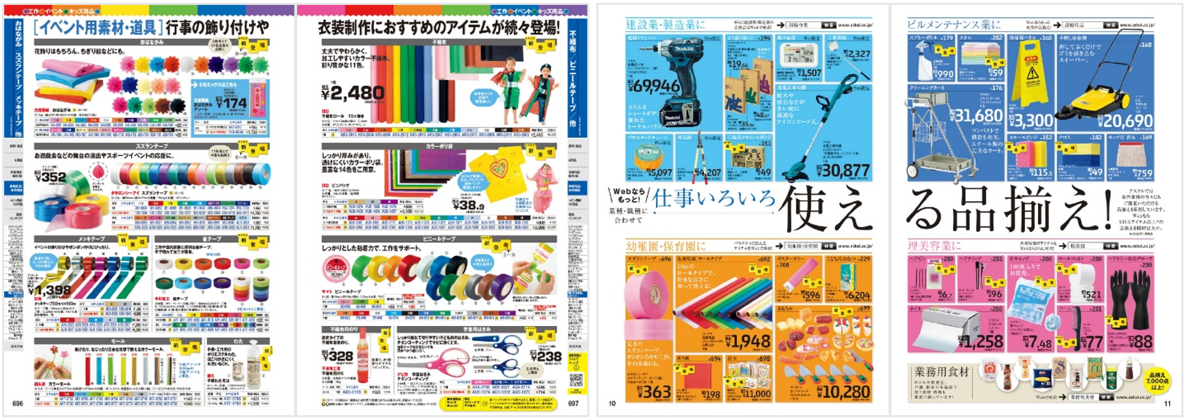 アスクルでは、様々な業種・職種のお客様の必需品を拡充しています。今号では、幼稚園や保育園などの教育施設や介護業種のお客様からの要望にお応えし、カタログ内に「工作・イベント・キッズ用品」コーナーを新設しました。画用紙・折り紙・おはながみ等の教育用ペーパーや絵の具のほか、室内装飾用のメッキテープ、衣装制作用の不織布ロールやカラービニール袋などの品揃えを大幅に拡充し、教育・介護業種でのイベントニーズにお応えします。さらに幼稚園・保育園向けには、「はらぺこあおむし」や「ノンタン」をはじめとした各種絵本や、おままごとや工作ブロックなど幼稚園・保育園向け玩具の定番「マスセット」の商品も新登場です。
