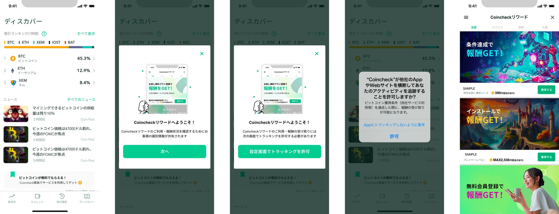 iOSアプリから「Coincheckリワード」をご利用いただくためには、トラッキングの許可が必要となります(画像参照)。「App にトラッキングしないように要求」を選択された場合、「Coincheckリワード」はご使用いただけませんのでご注意ください。