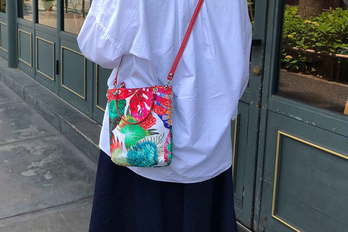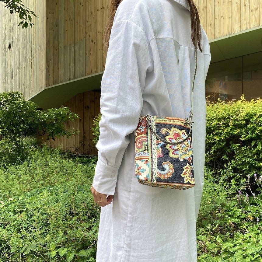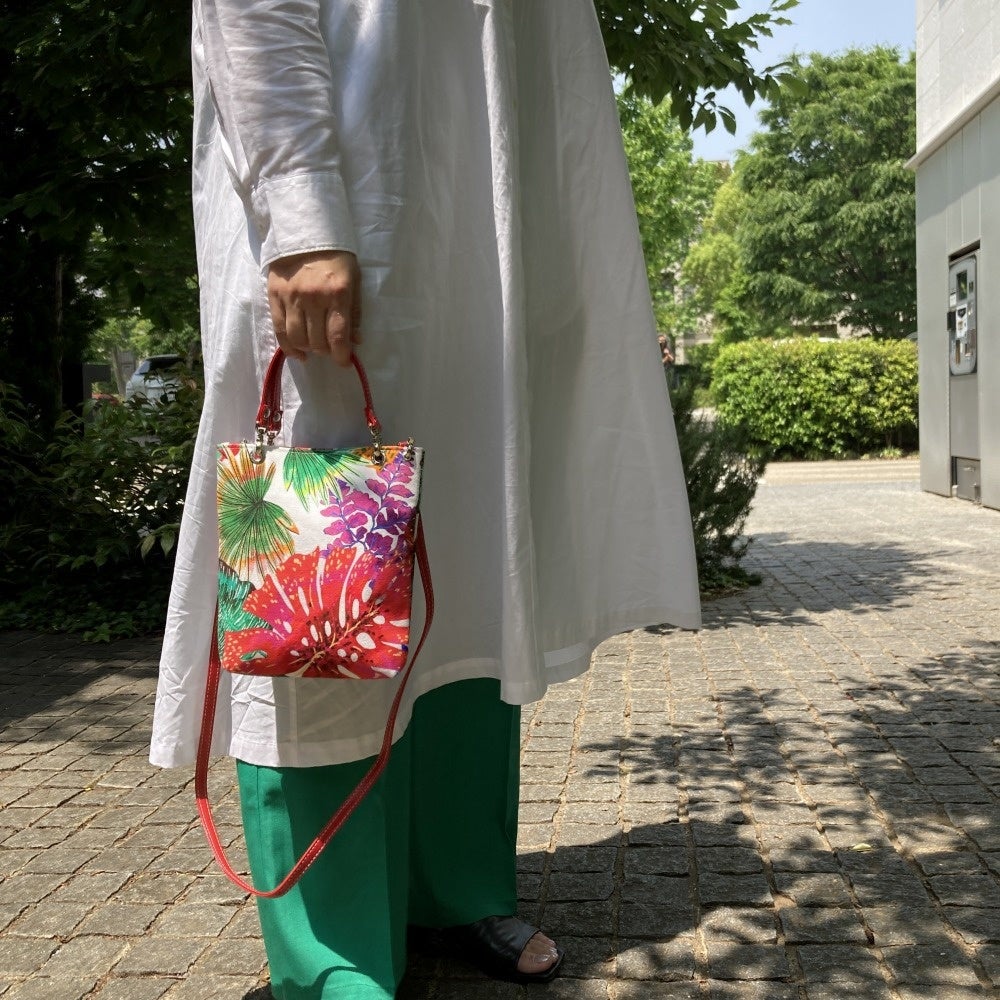 明るいカラーのショルダーベルトと華やかな柄のミニバッグの組み合わせはシンプルな装いのアクセントにぴったり。ショルダーバッグ・ハンドバッグの2way仕様で、その日の装いに合わせてコーディネートできます。
