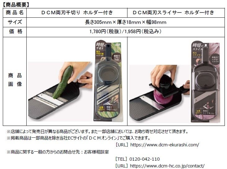 全国でホームセンター事業を展開するDCM株式会社(東京都品川区、代表取締役社長:石黒靖規、以下DCM)は、前後の千切り刃とスライス用の両刃を組み合わせることにより短時間で千切りできる「DCM両面千切り ホルダー付き」を、2023年3 月17 日(金)より全国のDCM・ケーヨーデイツー 店舗 一部店舗を除く)にて発売します 。