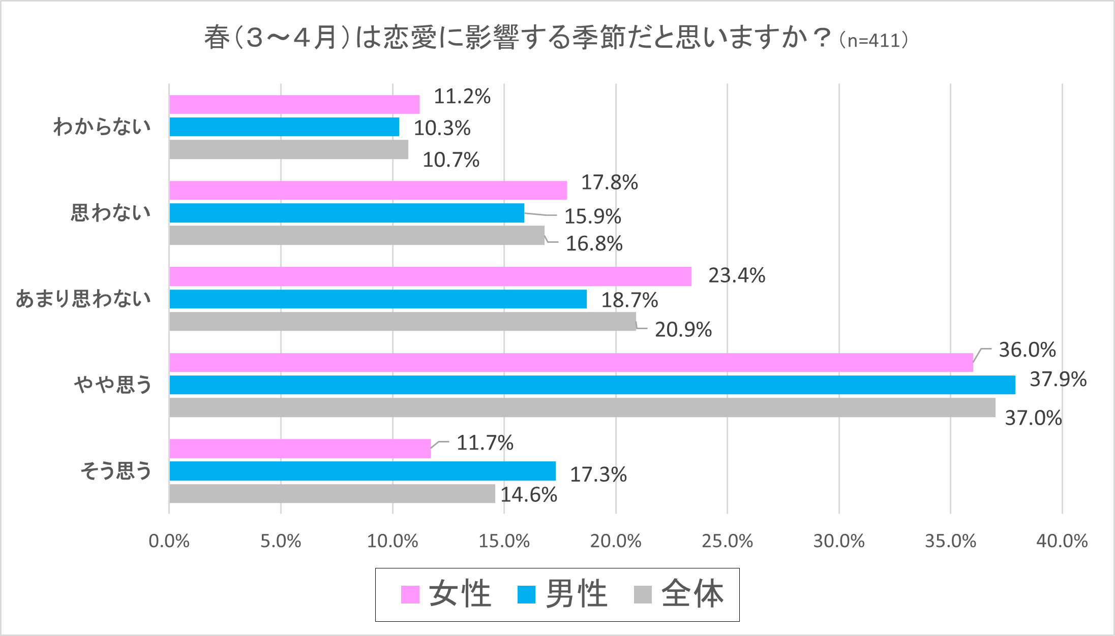 最初の設問では調査対象の独身男女411人に「春(3~4月)は恋愛に影響する季節だと思いますか?」と質問しました。「そう思う」と回答したのは全体14.6%、男性17.3%、女性11.7%で、「やや思う」が全体で37.0%、男性37.9%女性36.0%という結果となり、2つの回答をあわせると全体で約5割にあたる51.6%から「そう思う」あるいは「やや思う」という回答となりました。